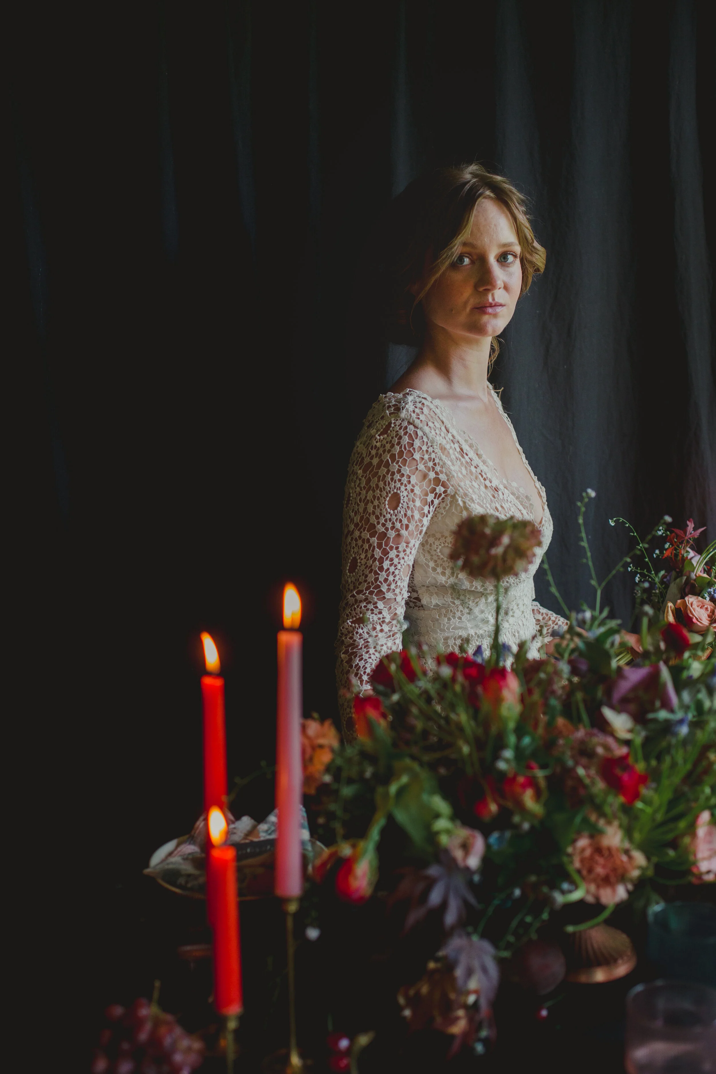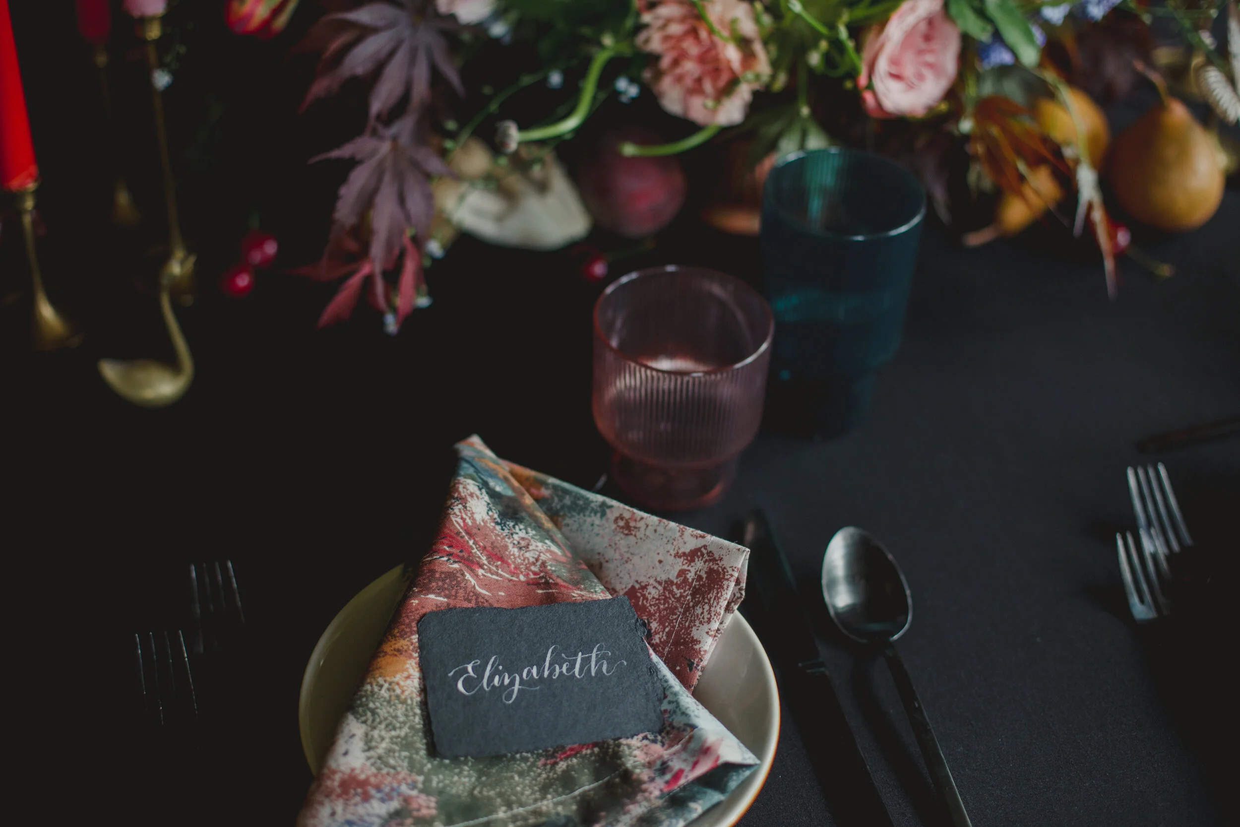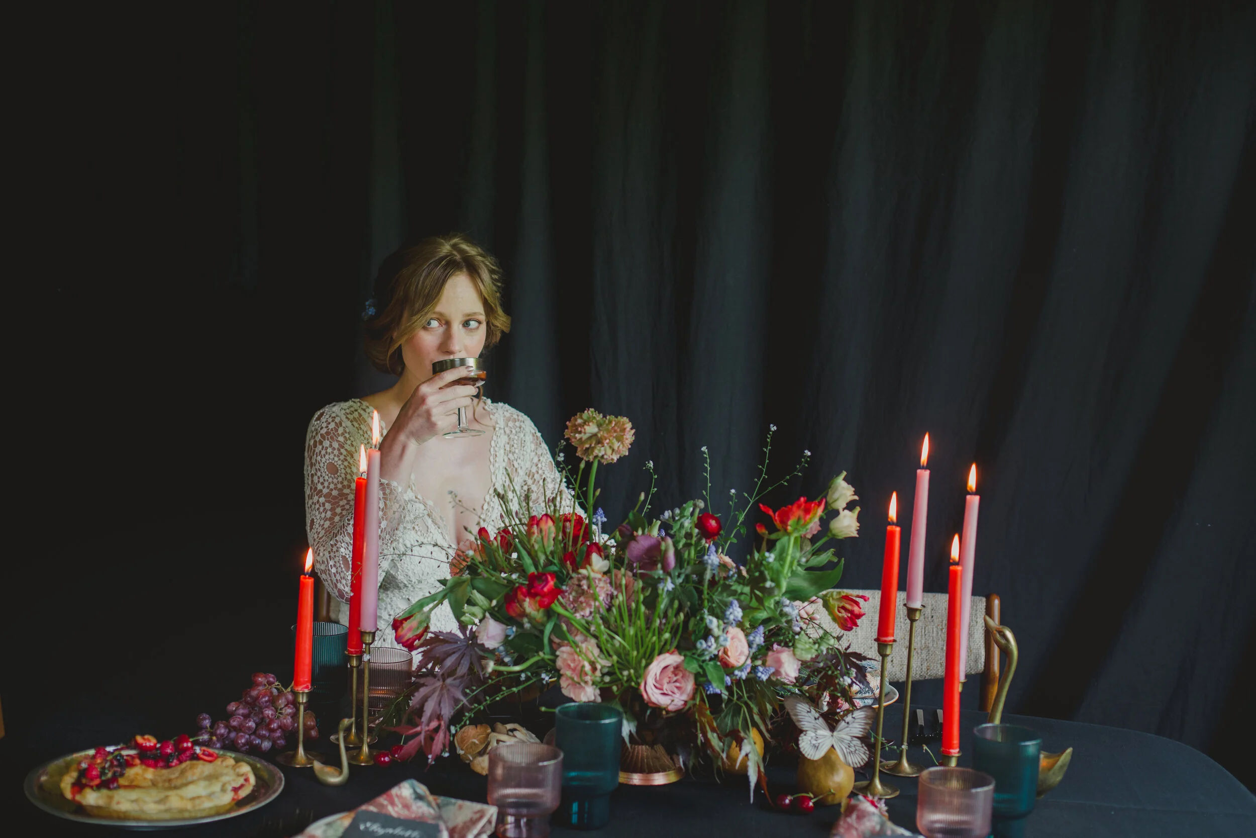 When Morgan of Valley Flower Company reached out that she wanted to collaborate on a dark and moody styled shoot, I immediately thought of my favorite art world inspiration: Dutch Still Life Paintings. We relied mostly on paintings from the 16th and 17th century to give us inspiration, mixing botanicals, insects, brass objects, and fruit. When we brought Lindsey Leichthammer on board for both calligraphy and food styling, the cheese and fruit trays she styled perfectly tied every element together. The three of us decided to bring hair and makeup stylists whose work we admired AND who we knew we’d have a fun time with, so it was an easy decision to ask Elizabeth England to work her makeup magic on Kym, who not only was an insanely talented model, but also made our hair dreams come true with the loose, natural styling of her own hair, as the owner of Omnia Hair Studio.