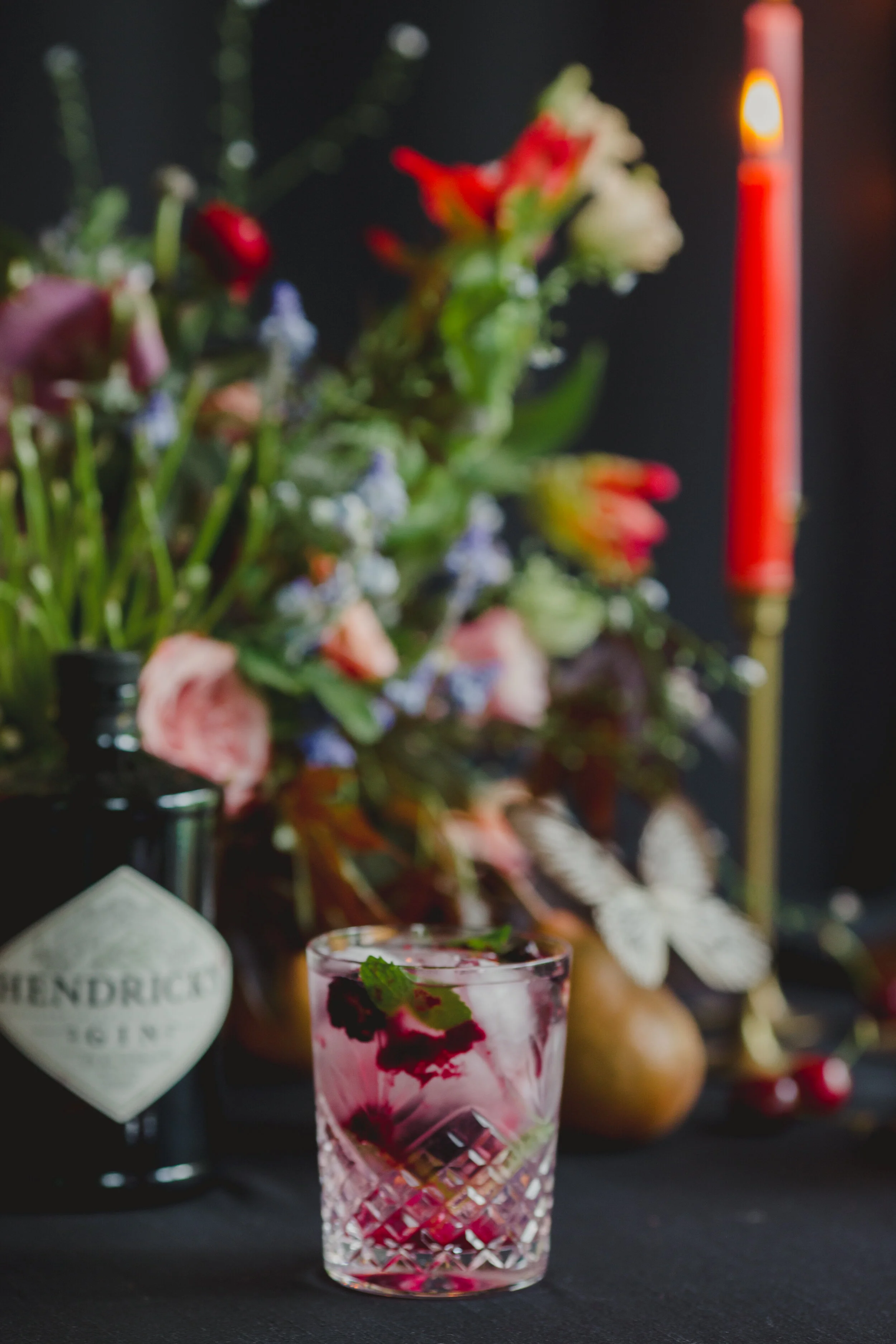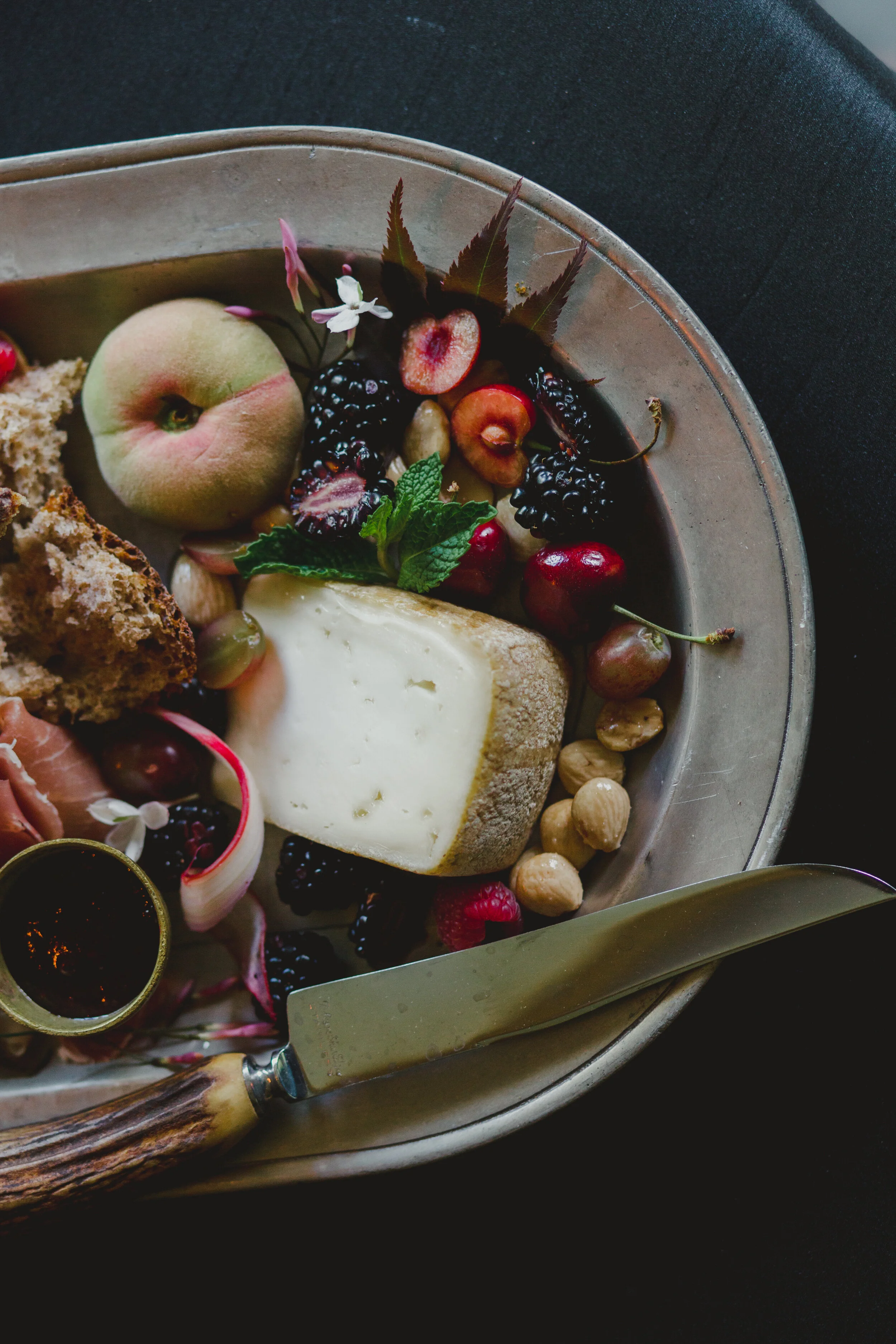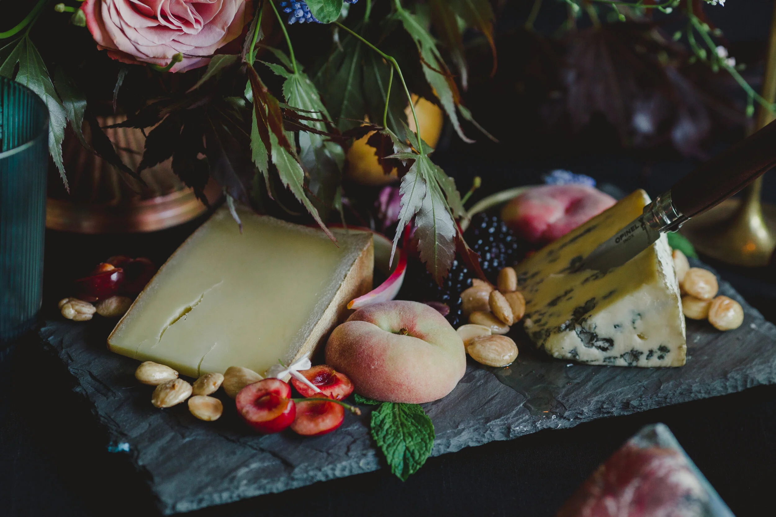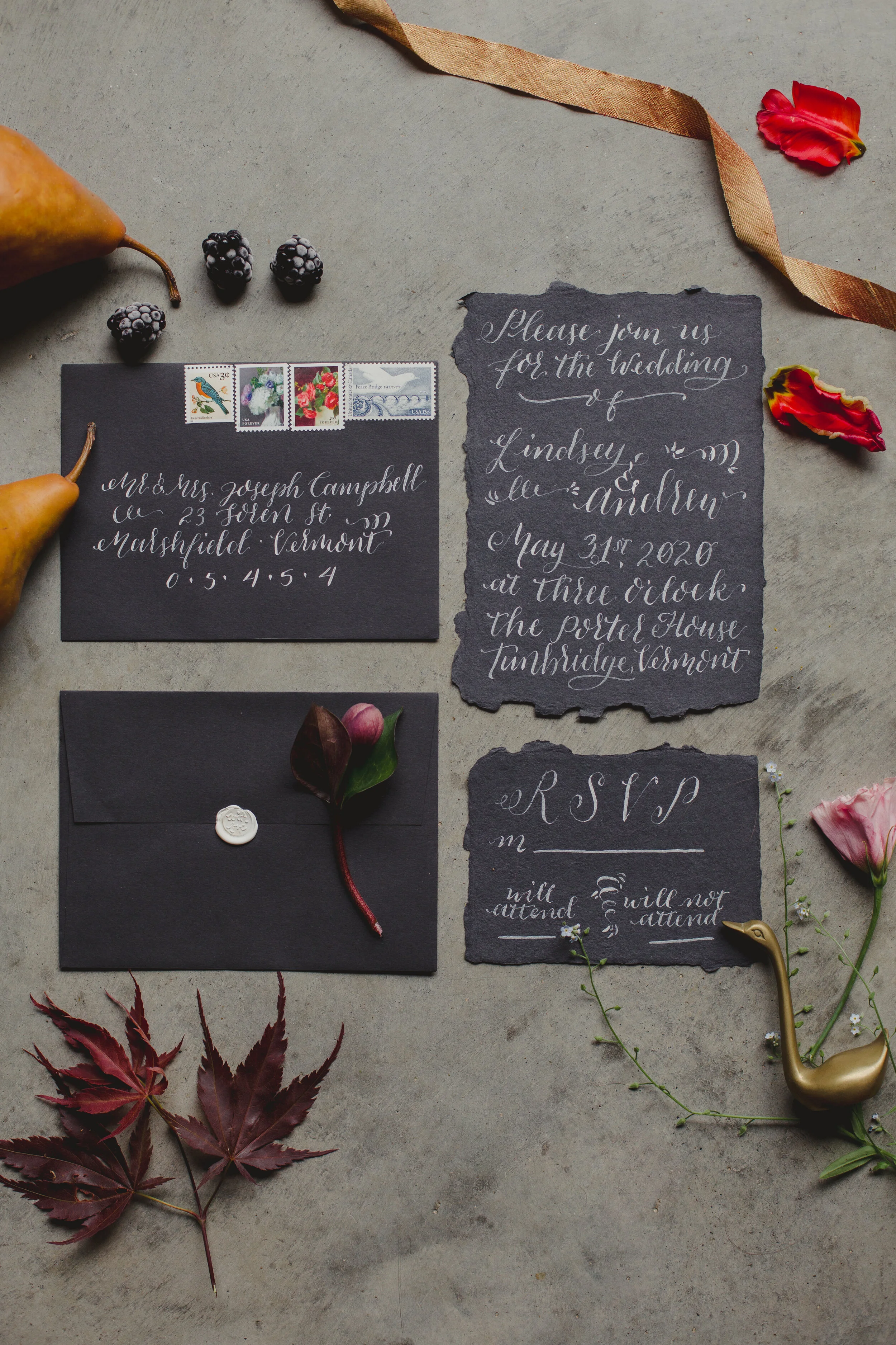 When Morgan of Valley Flower Company reached out that she wanted to collaborate on a dark and moody styled shoot, I immediately thought of my favorite art world inspiration: Dutch Still Life Paintings. We relied mostly on paintings from the 16th and 17th century to give us inspiration, mixing botanicals, insects, brass objects, and fruit. When we brought Lindsey Leichthammer on board for both calligraphy and food styling, the cheese and fruit trays she styled perfectly tied every element together. The three of us decided to bring hair and makeup stylists whose work we admired AND who we knew we’d have a fun time with, so it was an easy decision to ask Elizabeth England to work her makeup magic on Kym, who not only was an insanely talented model, but also made our hair dreams come true with the loose, natural styling of her own hair, as the owner of Omnia Hair Studio.